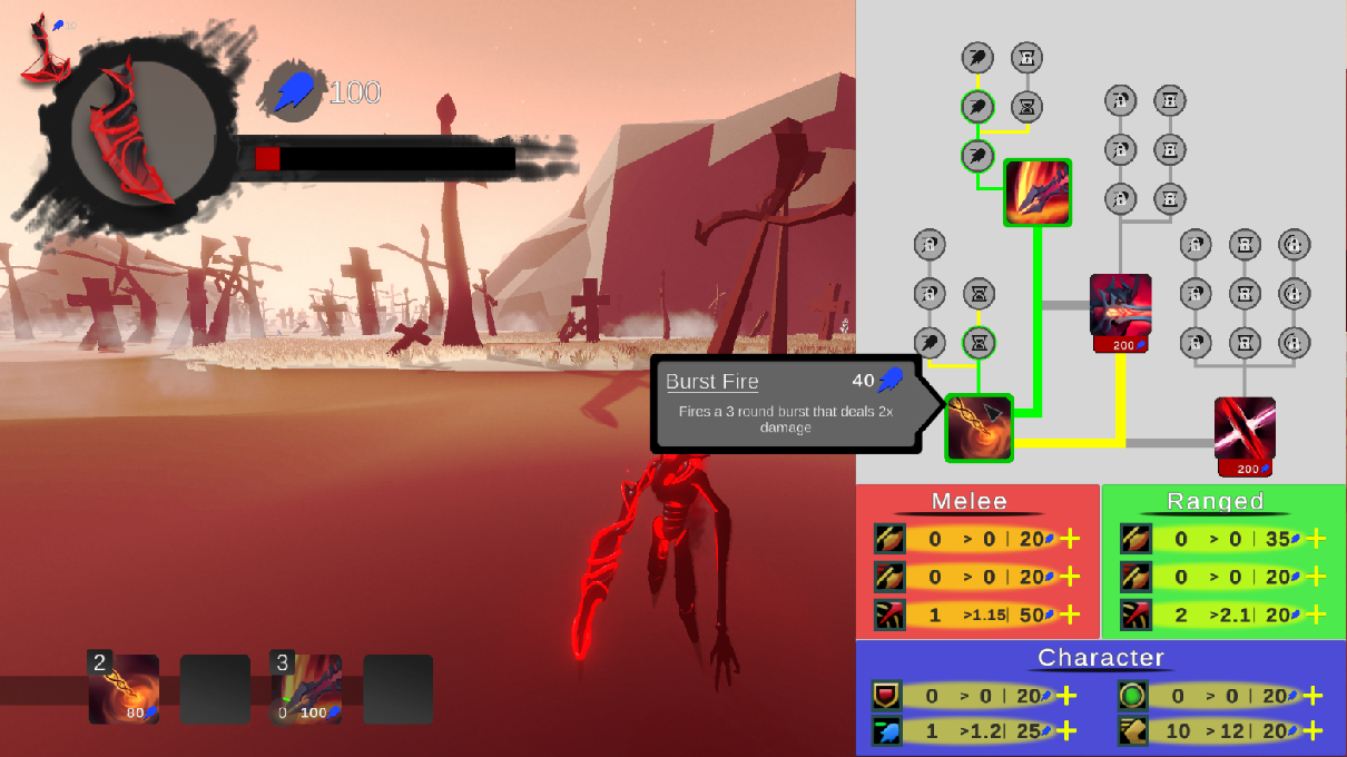 The development of the ability system was a cornerstone for this project, being the largest part of development for me in this project, comprising of numerous systems that are required to interact with each other. These systems include the mechanics of, equipping and using abilities, skill tree for unlocking new abilities, per-ability upgrades, character stats upgrades and core ability functionality (resource costs, cooldown, etc).